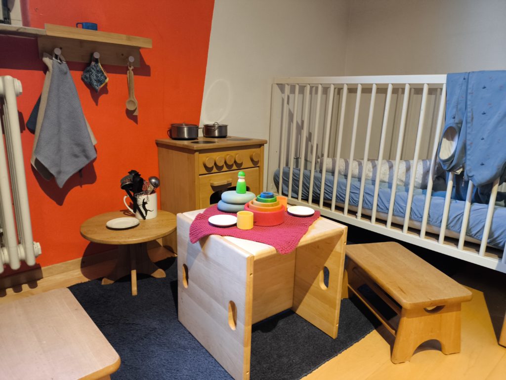 Die Kindergruppe befindet sich im Erdgeschoss von unserem Haus, wir haben ein Spiel-/ Schlafzimmer und ein Esszimmer. Unser großer Garten lädt die Kinder zum Spielen ein. Ein Sandkasten, eine Schaukel und ein Spielhaus stehen bereit.
